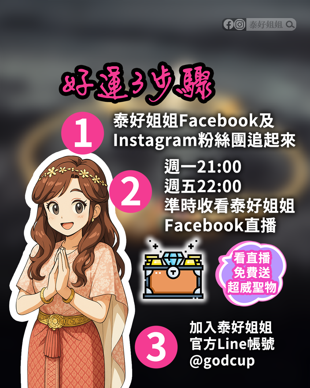 準時鎖定每週一晚上9點、週五晚上10點的泰好姐姐直播,讓你好運立即到!