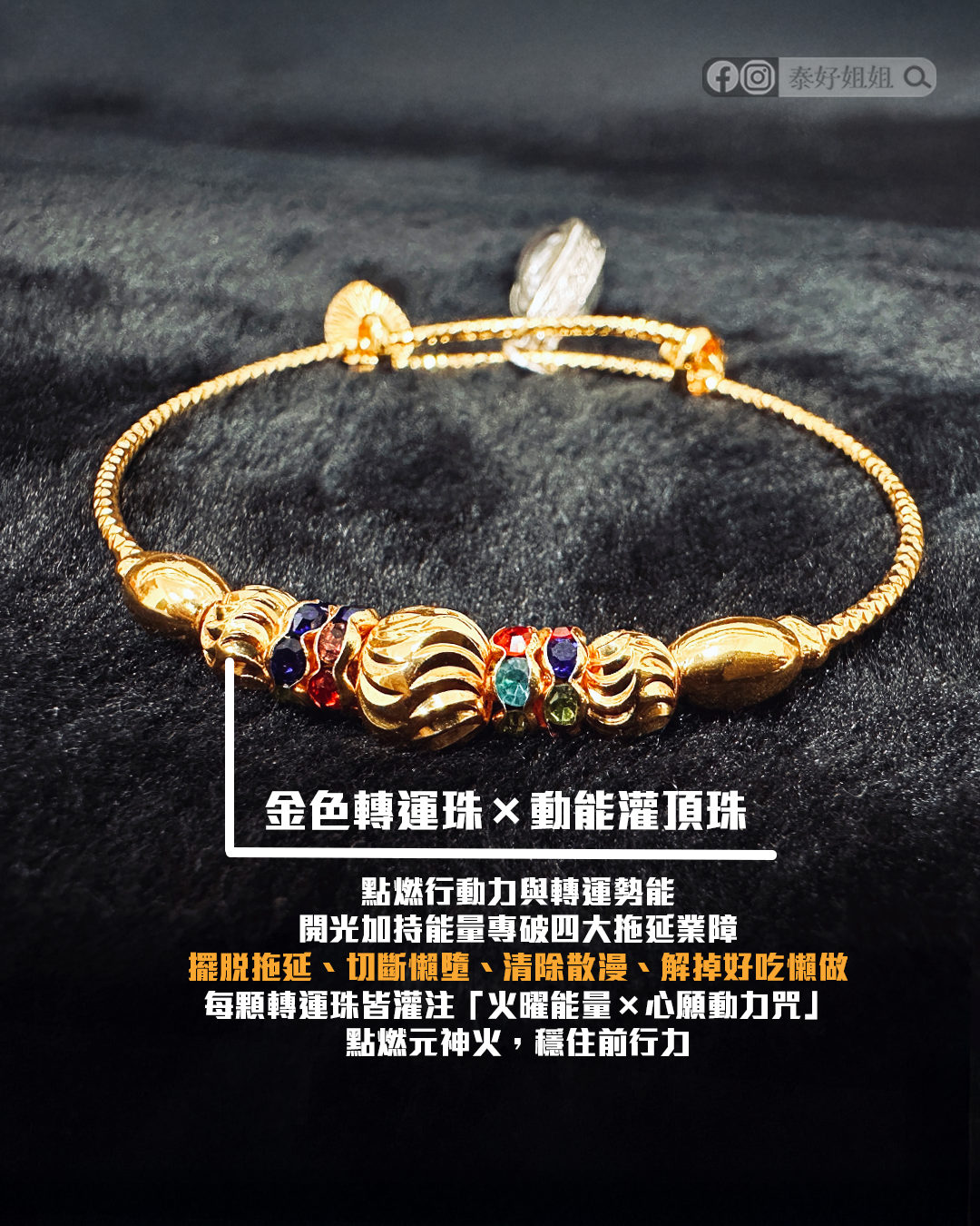 手環上的金色轉運珠與動能灌頂珠,象徵點燃火曜能量與心願動力。
