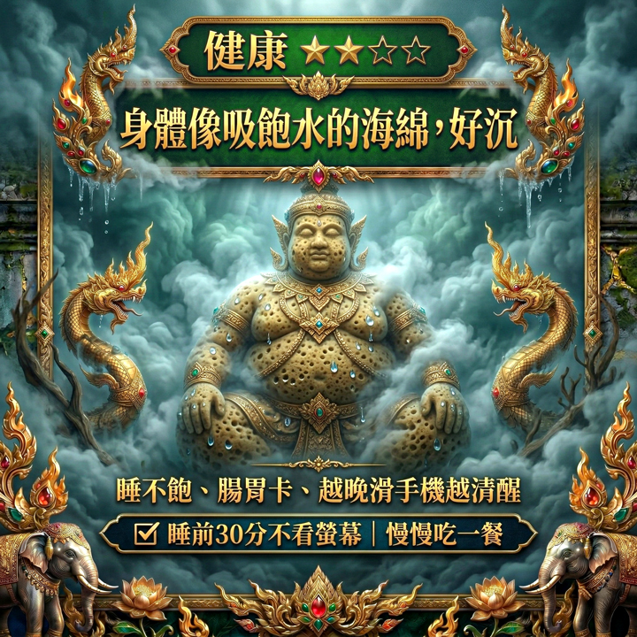 水氣偏重、代謝變慢,身體像被一層濕氣包住。雖然沒有明顯生病,但整個人發沉,睡不飽、腸胃卡卡,情緒也跟著悶。