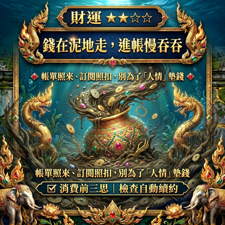 需小心避免一邊等轉帳、一邊先把錢墊出去。帳單照來、訂閱照扣,還夾著維修費、補款或之前答應的人情支出。滑手機時很容易多點幾筆小額,當下只是「先買一下」,月底回頭看會皺眉。心裡會有種疲勞感,像一直在處理錢,卻沒有明顯增加。
