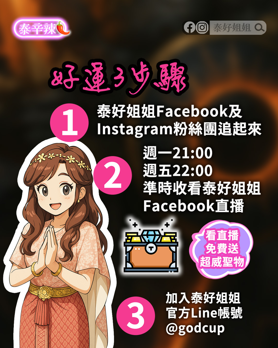 準時鎖定每週一晚上9點、週五晚上10點的泰好姐姐直播,讓你好運立即到!