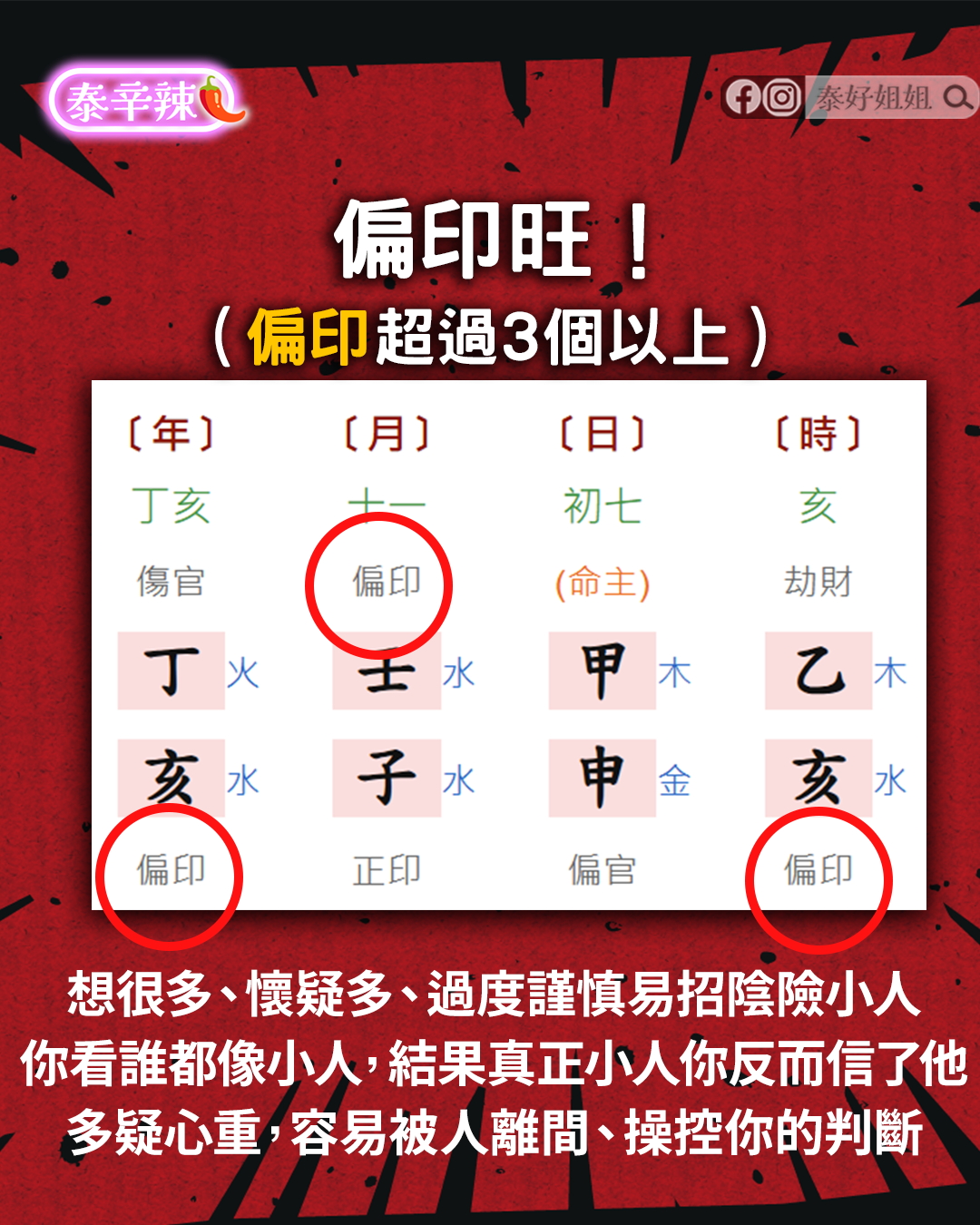 偏印代表資源、學識與內在感知,適度的偏印能讓人敏銳、洞察力強。然而,當偏印過旺,尤其日主又過弱無法駕馭時,這種敏感會轉變成過度謹慎、多疑與防備。偏印旺的人容易陷入「誰都像小人」的心理陷阱,結果真正的小人反而得逞。