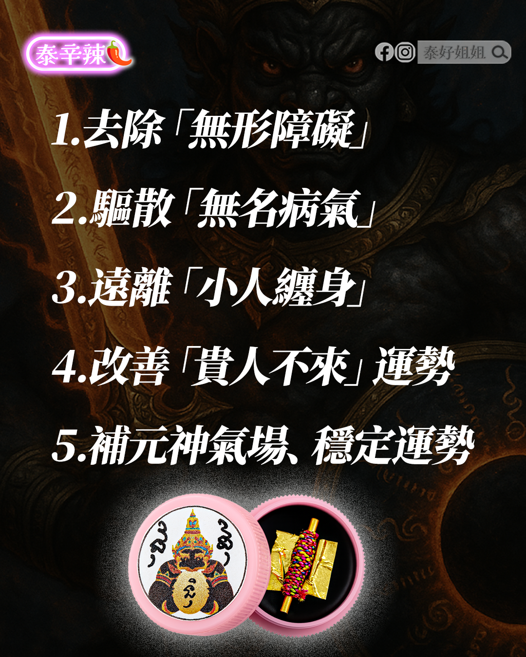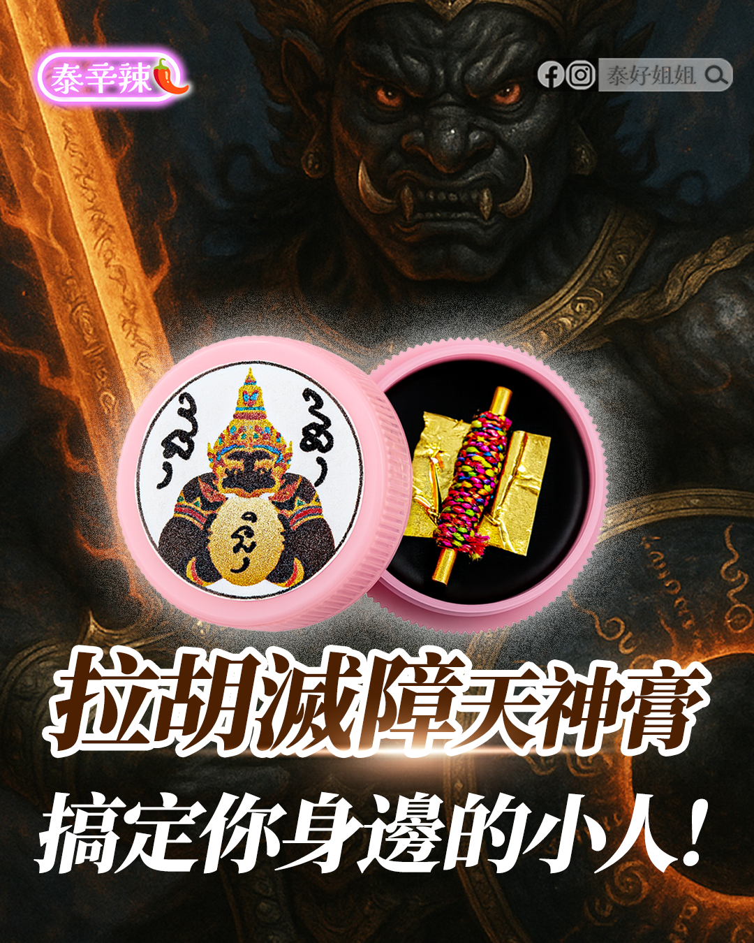 在泰國佛教文化中,拉胡天神是專門負責驅邪避障、調整命運能量的守護神祇。拉胡滅障天神膏,正是結合了這種信仰能量的靈性聖物。經過高僧開光加持的天神膏,能在能量層面協助你去除無形障礙,驅散無名病氣,讓阻礙你的小人退散。