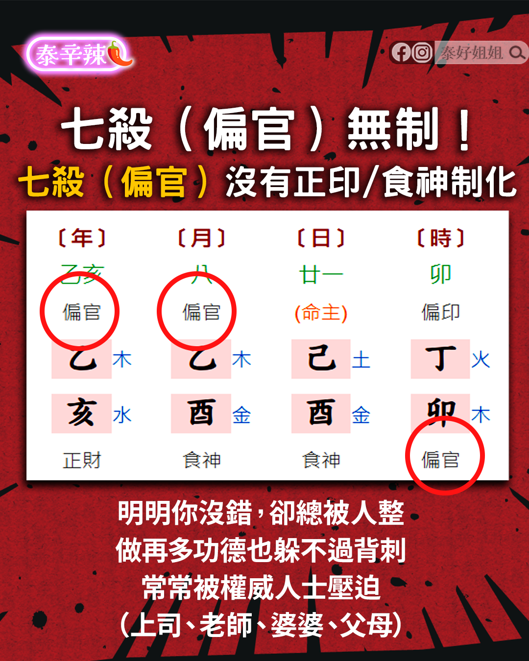 七殺(偏官)是充滿挑戰與行動力的能量,但如果命盤中沒有正印或食神來制化,七殺就會變成不受控制的破壞力量。這類人即使沒有做錯事,也常常成為權威壓迫的對象。上司、老師、婆婆或父母可能會對你施壓,甚至背後算計,讓你感覺再多努力都無法獲得肯定。