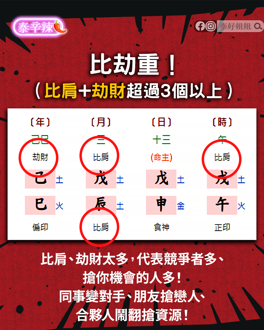 當你發現命盤中「比肩」「劫財」超過三個,就要特別小心。這並不代表你必然失敗,而是提醒你在競爭激烈的環境中,更需要智慧與策略去處理人際。適時地退讓、建立清晰的合作規則,以及謹慎選擇合夥對象,都是降低風險的方式。